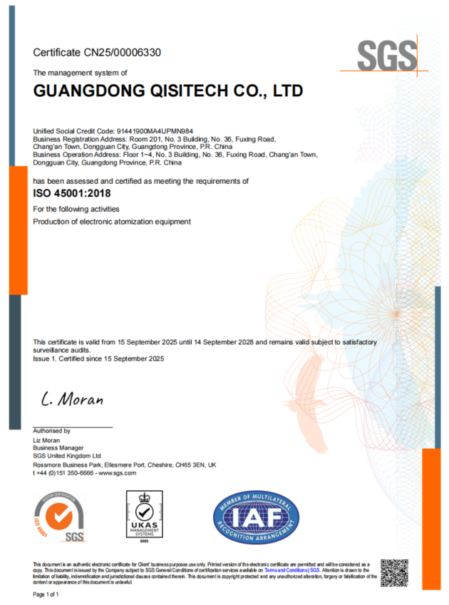 Recently, Geekvape’s wholly-owned subsidiary Guangdong Qisitech Co., Ltd. (hereinafter referred to as “Guangdong Qisi”) successfully attained the international ISO14001 Environmental Management System and ISO45001 Occupational Health and Safety Management System certifications. This achievement underscores Guangdong Qisi’s commitment to environmental protection and employee well-being through green manufacturing and a people-oriented approach, marking a new milestone in its journey towards sustainability.