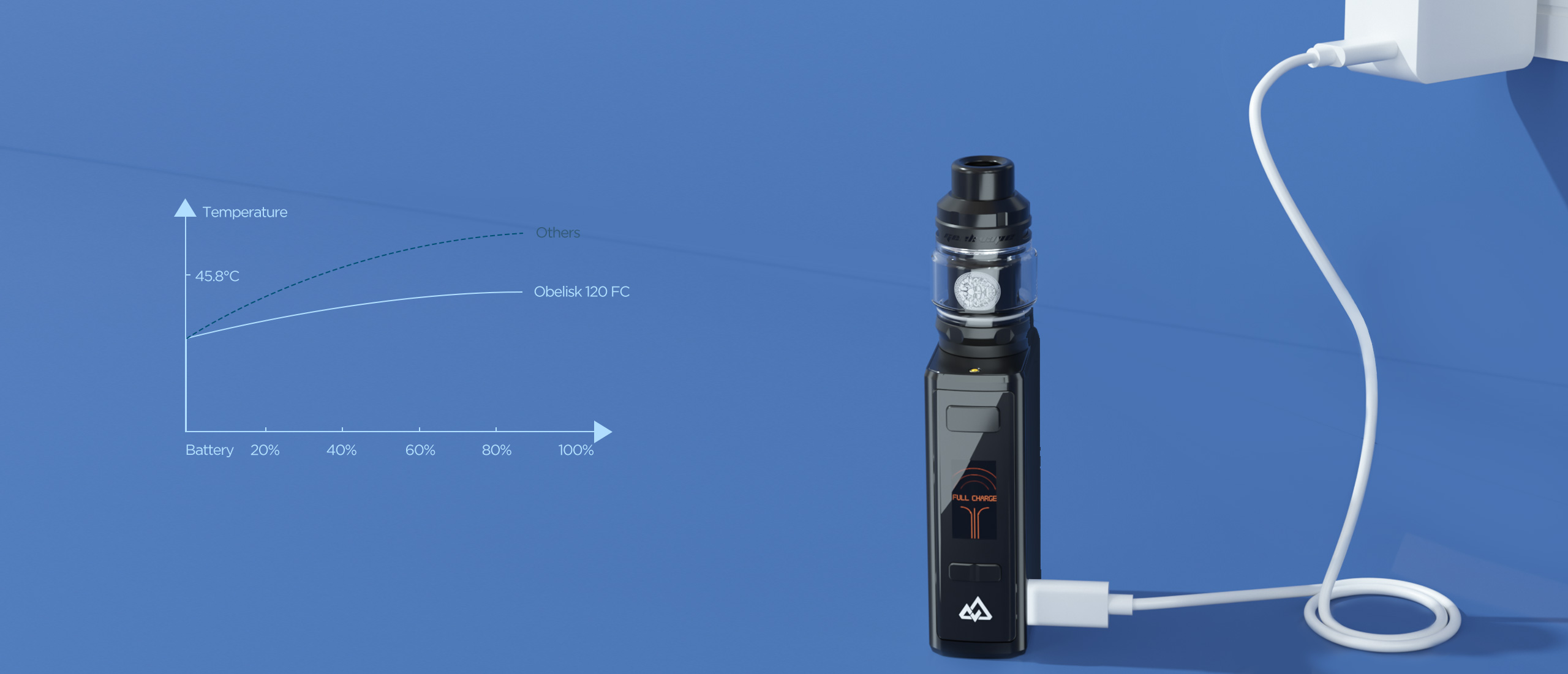 Directly charge a 3700mAh vape in 15 minutes with USB-C cable, astonishingly fast and assuredly safe. Ultra-long battery life keeps up for 2 days and allows to share your power with loved ones. Co-worked perfectly with leakproof Geekvape Z Sub-ohm Tank, Obelisk 120 FC awaits you to explore.